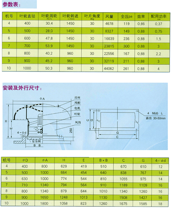 WZT4-10型屋顶轴流排风机使用于电站、化工、纺织、工厂、仓库、体育场所及各种建筑物屋的有动力通风机。 一、结构 风机由玻璃钢防雨帽、进口帽、叶轮、点机直联结构、造型美观、风阻小。 二、性能 1.节能,适合全面通风的低压大流量通风场所,与其他同类产比较,在相同流量下,电机消耗功率最低,达到综合节能的目的。 2.噪音低,小于60db。 三、工作环境条件 1.温度:为-40度至50度的空气,相对湿度不超过85%,含尘量不超过每立方米100mg的工作场所。 2.电源:电压380V三相50Hz。